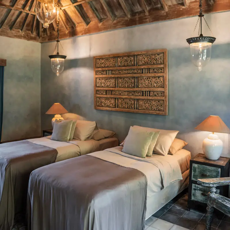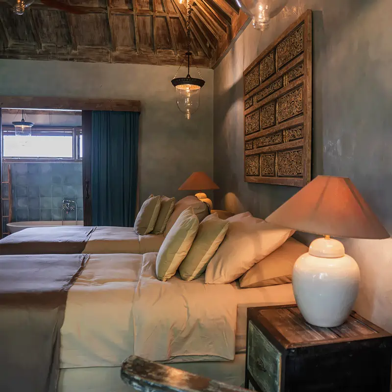 The Barisan Superior Room at Balquisse Heritage Hotel in Jimbaran, Bali blends heritage design with modern comfort, making it ideal for a romantic getaway in Bali or a serene retreat. Featuring twin beds draped in soft linens, handcrafted wooden furnishings, and curated vintage décor, the room captures the charm of a boutique hotel in Jimbaran. The spacious ensuite bathroom is styled with artisanal tiles, double stone sinks, and a freestanding bathtub perfect for relaxation. Guests enjoy thoughtful amenities including air conditioning, Wi-Fi, minibar, safety box, and daily housekeeping. Whether you’re seeking a luxury hotel in Jimbaran for couples, a tranquil base for exploring Bali, or a stay infused with authentic Balinese artistry, the Barisan Superior Room offers timeless comfort within the lush tropical setting of Balquisse Heritage Hotel. Unwind in the Barisan Superior Room at Balquisse Heritage Hotel Bali, where rustic charm meets refined comfort, thoughtfully designed boutique hotel room offers a tranquil Jimbaran stay near the beach. Surrounded by tropical greenery and styled with vintage details, it’s the perfect escape for travelers seeking a peaceful hotel room near Jimbaran Beach with authentic Balinese character. Nestled within the tranquil grounds of Balquisse Heritage Hotel Jimbaran Bali, our Superior Rooms embody the essence of timeless elegance. Situated in the hotel's original wing, each room is a tribute to Balinese architectural heritage, adorned with artisanal touches that reflect the island’s craftsmanship. Thoughtfully designed for relaxation, these rooms invite guests to unwind amidst serene views and soothing surroundings, offering a peaceful retreat where comfort and cultural authenticity converge.